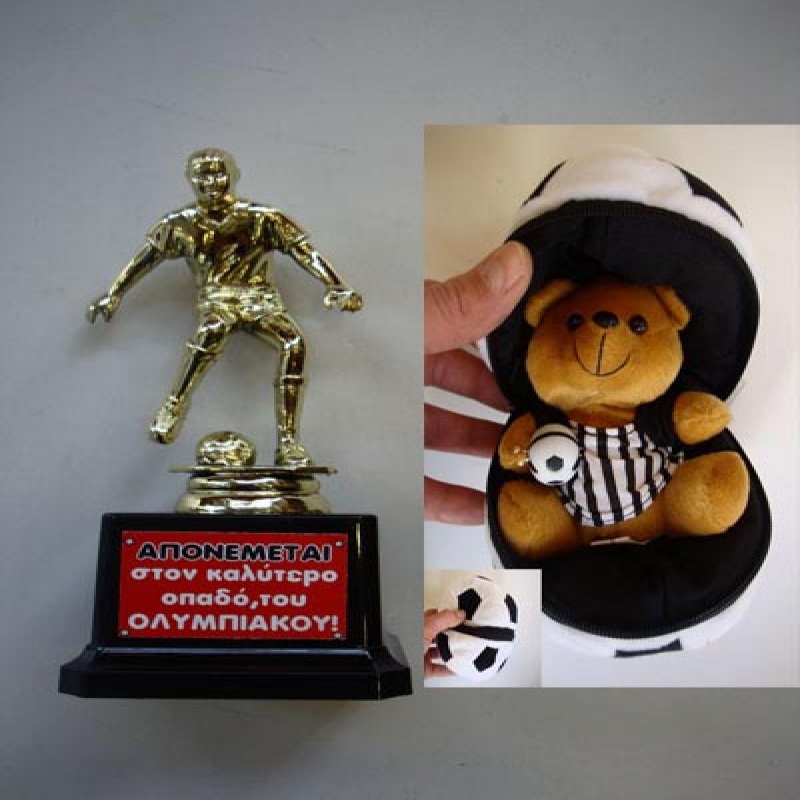 Σετ κύπελλο 17cm και μπάλα 20cm, το κύπελλο γράφει "Απονέμεται στον καλύτερο οπαδό του Ολυμπιακού" και η μπάλα όταν ανοίγουμε το φερμουάρ έχει μέσα ένα αρκουδάκι που κρατά μία μικρή μπαλίτσα (Άλλη μία επιλογή από τα δώρα Αγίου Βαλεντίνου)