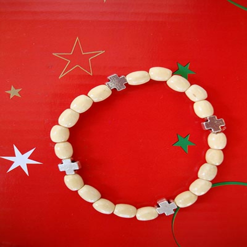 Μπεζ ελαστικό αξεσουάρ χεριού με ξύλινες μπίλιες και 4 σταυρουδάκια