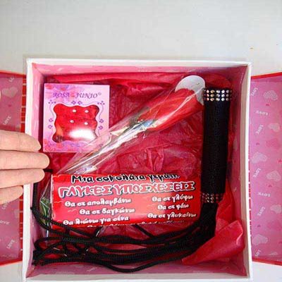 Κόκκινο κουτί με καλτσόδετα, λουλούδι, στρινγκ, μαστίγιο και σοκολάτα
