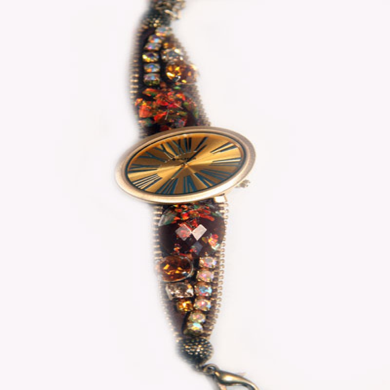 Γυναικείο χειροποίητο ρολόι σε χρυσό, υφασμάτινο λουράκι με πολλά εντυπωσιακά στρας και αυξωμειώμενη αλυσίδα(172-17)